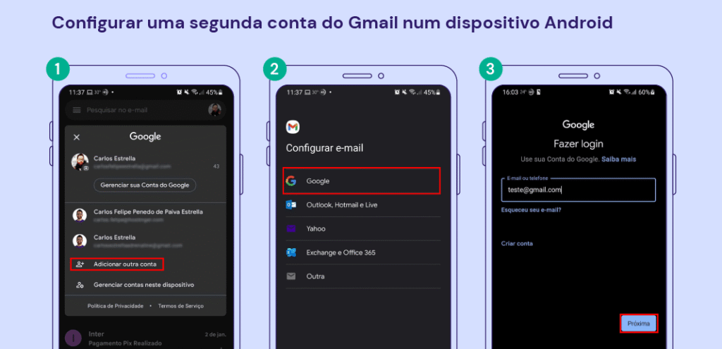 Aqui estão os passos para configurar uma segunda conta do Gmail no mesmo dispositivo Android: